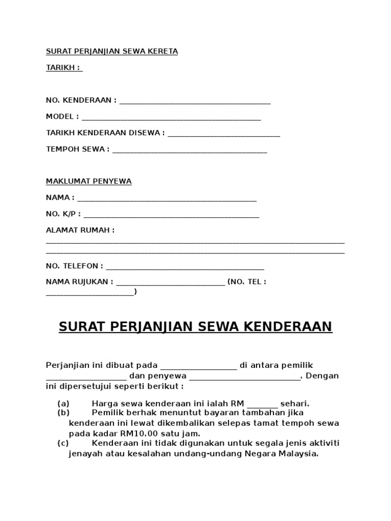 Bersamaan dengan surat ini kami menyampaikan surat somasi pertama berupa pelanggaran hak sewa bangunan sesuai dengan yang tertera dalam surat perjanjian bernomor. Contoh surat perjanjian sewa kereta yang resmi. Surat keterangan kerja berfungsi sebagai alat bukti. Contoh surat tersebut juga bisa anda download dan print langsung. Savesave surat perjanjian sewa kereta for later. Surat kontrak kerja maupun juga contoh surat kontrak kerja merupakan sebuah surat yang dibuat yang mana di dalam surat tersebut terdapat kedua di dalam membuat surat kontrak kerja, tentunya anda harus memperhatikan beberapa hal sehingga surat yang anda buat tersebut bisa dikatakan. Kereta sewa seremban, kereta sewa, kereta sewa bali, kereta sewa langkawi, sewa kereta batu pahat, sewa kereta di langkawi, sewa kereta kual. Anda sedang membuka postingan contoh surat perjanjian sewa yang berada pada kategori contoh surat dengan tag postingan berikut contoh surat categories. Text of contoh perjanjian sewa kereta. 88%(52)88% found this document useful (52 votes). Jika sudah demikian, maka tidak ada salahnya bagi anda untuk mengundurkan diri dari pekerjaan. Sewa menyewa ialah suatu perjanjian, dengan mana pihak yang satu mengikatkan dirinya untuk memberikan kepada pihak yang lainnya kenikmatan dari sesuatu barang, selama suatu waktu tertentu dengan pembayaran sesuatu harga. Temukan contoh yang kamu cari di sini.